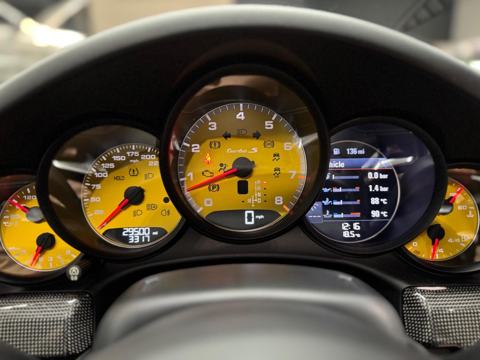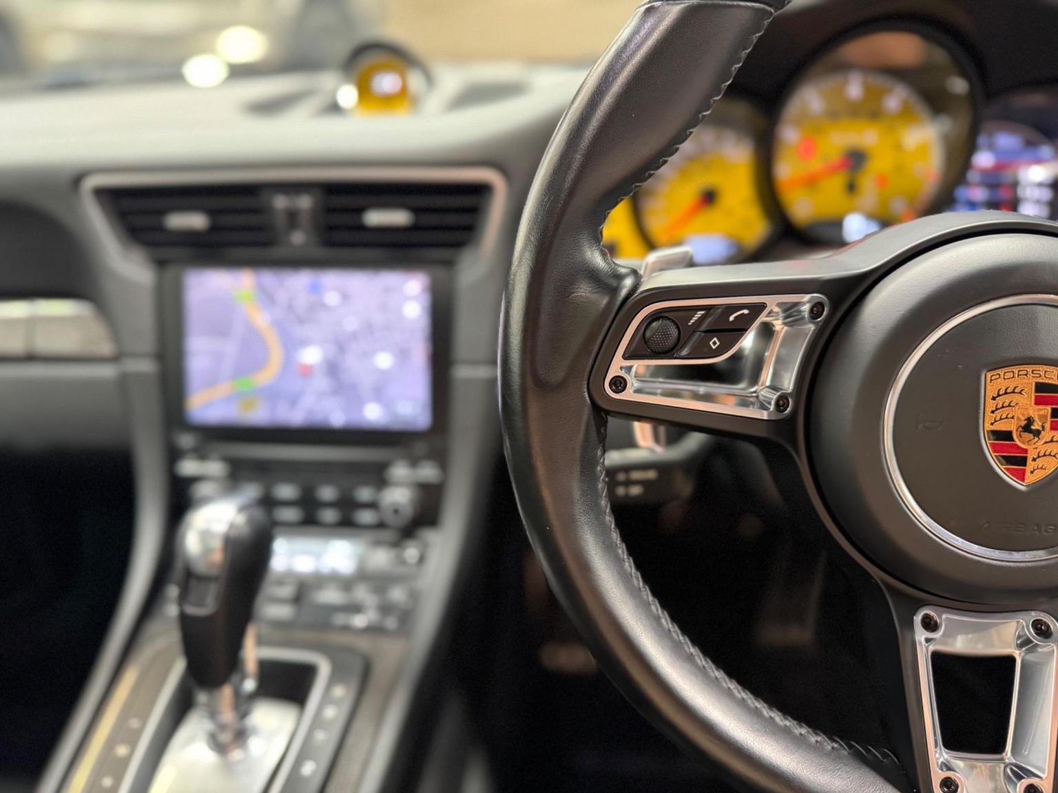 Cruise Control, Cupholders x2, Dashboard Trim-Centre Console Trim-Door Panel Trim in Carbon Finish, Daytime Running Lights - LED, Digital Display - Speed-Gear, Digital Radio - DAB - DAB+DMB, Door Mirrors - Electrically Adjustable and Heated, Door Mirrors - Memory Function, Door Mirrors - SportDesign, Door Sill Guards - Model Designation Logo, Driving Light Assistant, Dynamic Cornering Lights, Dynamic High Beam, Electric Parking Brake, Electric Windows - Lifts with One Touch Operation, Engine Immobiliser, Footwell Illumination, Front Lip Spoiler - Turbo S Logo, Front Side Airbags, Front Spoiler - Automatically Retractable 3-Level - Basic-Speed-Performance, Fuel Filler Cap with Aluminium Look Finish, Glove Compartment - Lockable, Green Tinted Heat-Insulating Glass, Headlight Cleaning System, Headlights - Automatic Dynamic Headlight Levelling, Headlights - Full LED inc PDLS + Porsche Dynamic Lighting System Plus, Heated Rear Screen, Heated Windscreen Washer Jets, ISOFIX Anchors for Child Seat Attachment on Rear Seats, Illuminated Vanity Mirrors in Both Sun Visors, Instrument Cluster with Central Rev Counter and 4.6in TFT VGA Display, Integrated Cluster of Five Round Instruments, Internet Access - Wireless, Key Remote Luggage Compartment Lid Release, LED Reading Lights Orientation Ignition Lock and Vanity Mirror Lighting, Luggage Compartment - Front, MSR - Motor Slip Regulation, On-Board Computer, PASM - Porsche Active Suspension Management, PCM - Porsche Communication Management - Include Navigation, PORSCHE Logo and 911 Turbo S Designation on Rear Apron - High-Gloss Chrome Finish, PSM - Porsche Stability Management, PTM - Porsche Traction Management, PVTS - Porsche Vehicle Tracking System, Pad-Wear Sensors on Each Brake Pad, Park Assist - Front, Park Assist - Rear, Particle-Pollen Filter with Active Carbon Filter, Porsche Active Aerodynamics - PAA, Porsche Car Connect - E-Mobility Services, Porsche Dynamic Light System Plus - PDLS Plus, Porsche Side Impact Protection - POSIP, Porsche Torque Vectoring Plus - PTV Plus with Electronically Locking Rear Differential, Porsche Vehicle Tracking System Plus, Power Assisted Steering with Variable Steering Ratio, Pre-Tensioners and Force Limiters at Front, Preparation for Roof Transport System, Rain Sensor, Remote Vehicle Status, Reversing Camera, Roof Lining in Alcantara, Seats - Electric Adjustment for Lumbar Support, Seats - Front Height Adjustable - Electric, Seats - Memory Package, Seats - Split-Folding Rear, Seats - Sports, Speakers x12, Sport Chrono Package, Steering Wheel - Gearshift Paddles, Steering Wheel - Manual Height and Fore-Aft Adjustment, Steering Wheel - Memory Function, Steering Wheel - SportDesign Leather, Storage Compartment in Each Door, Tailights - LED, Third Brake Light - LED, Two-Zone Automatic Climate Control, Tyre Pressure Monitoring - TPM, Tyre Sealing Compound and Electric Air Compressor, USB Connection in Centre Console Storage Compartment and Glove Box, Windscreen with Grey Top-Tint, 12-Volt Socket in Passenger Footwell, 20in Alloy Wheels - 911 Turbo S, ABD - Automatic Brake Differential, ABS - Anti-lock Brake System, ASR - Anti Slip Regulation, Adaptive Sports Seats Plus - Electrical 18 Ways, Airbag - Driver, Airbag - Head, Airbag - Passenger, Airbag - Thorax in Seat Side Bolsters, Alarm System, Analogue and Digital Stop Watch, Apple CarPlay, Automatic Coming Home Lights, Automatic Hill-Hold, Automatically Dimming Exterior and Interior Mirrors, BOSE Surround Sound System, Brake Assistant, Brake Calipers - Yellow, Central Locking with Remote Control, Clothes Hooks on Seat Backrests, Connect Plus